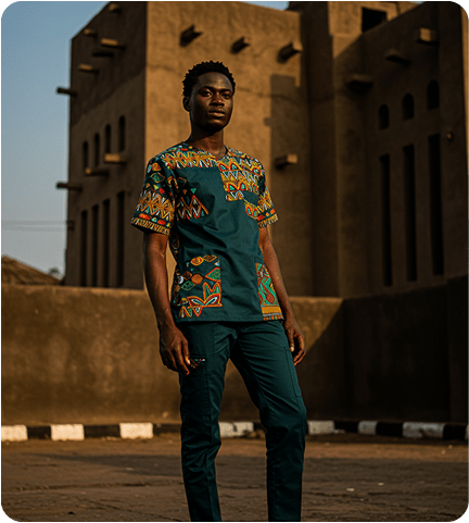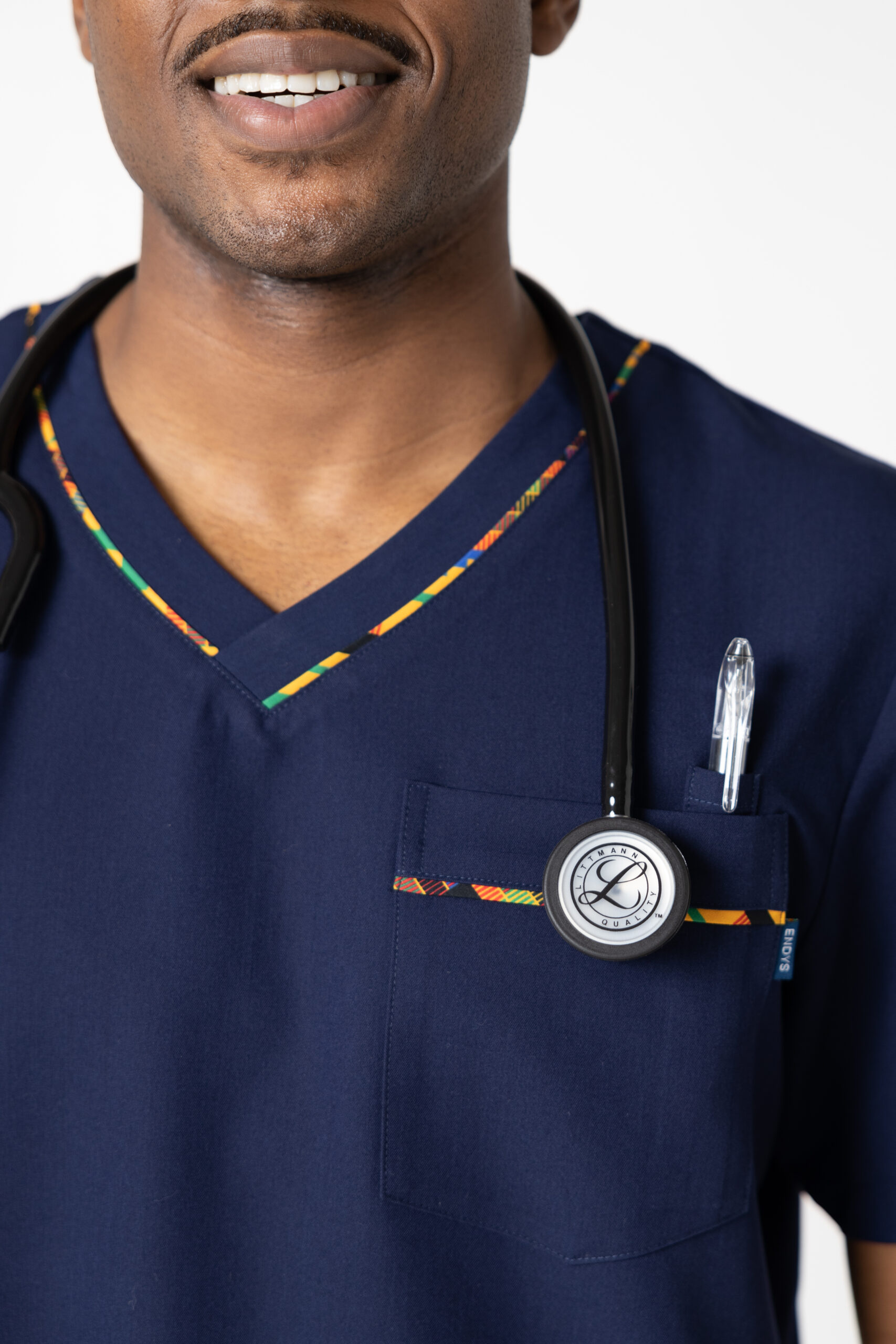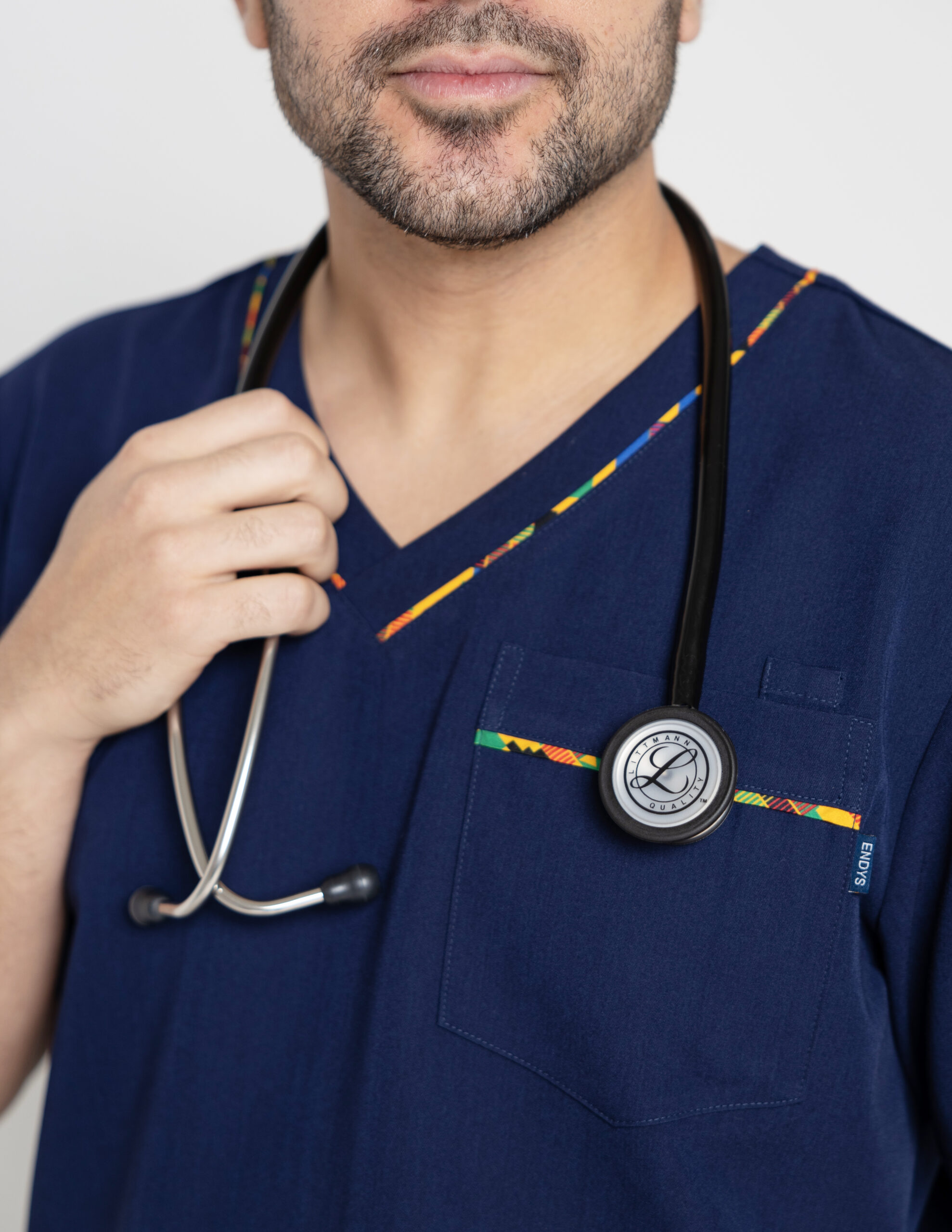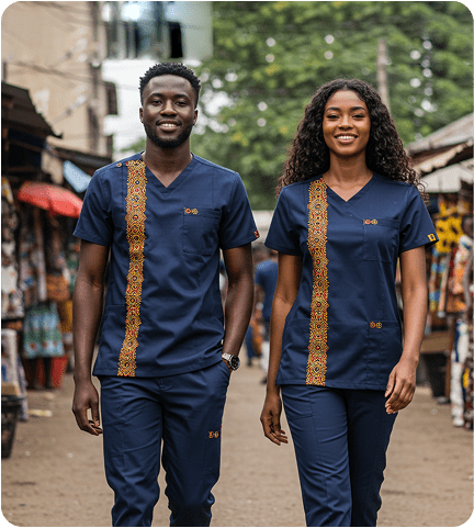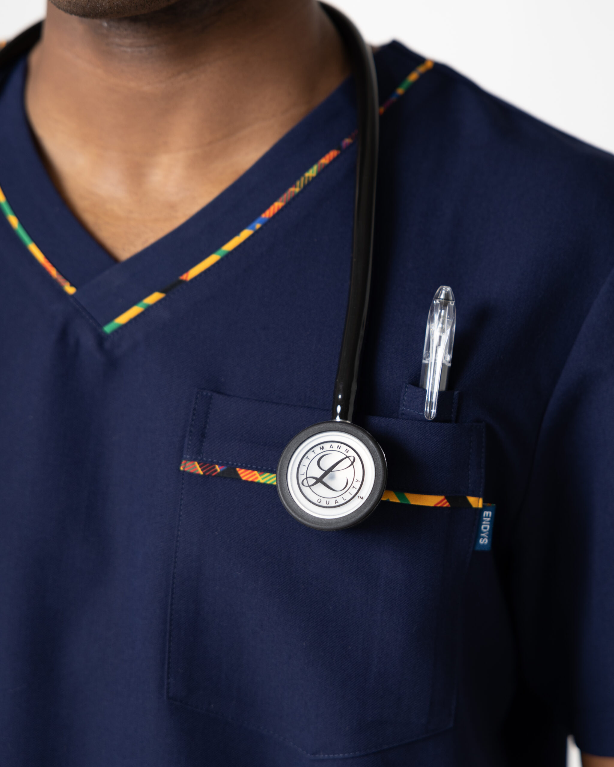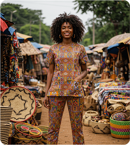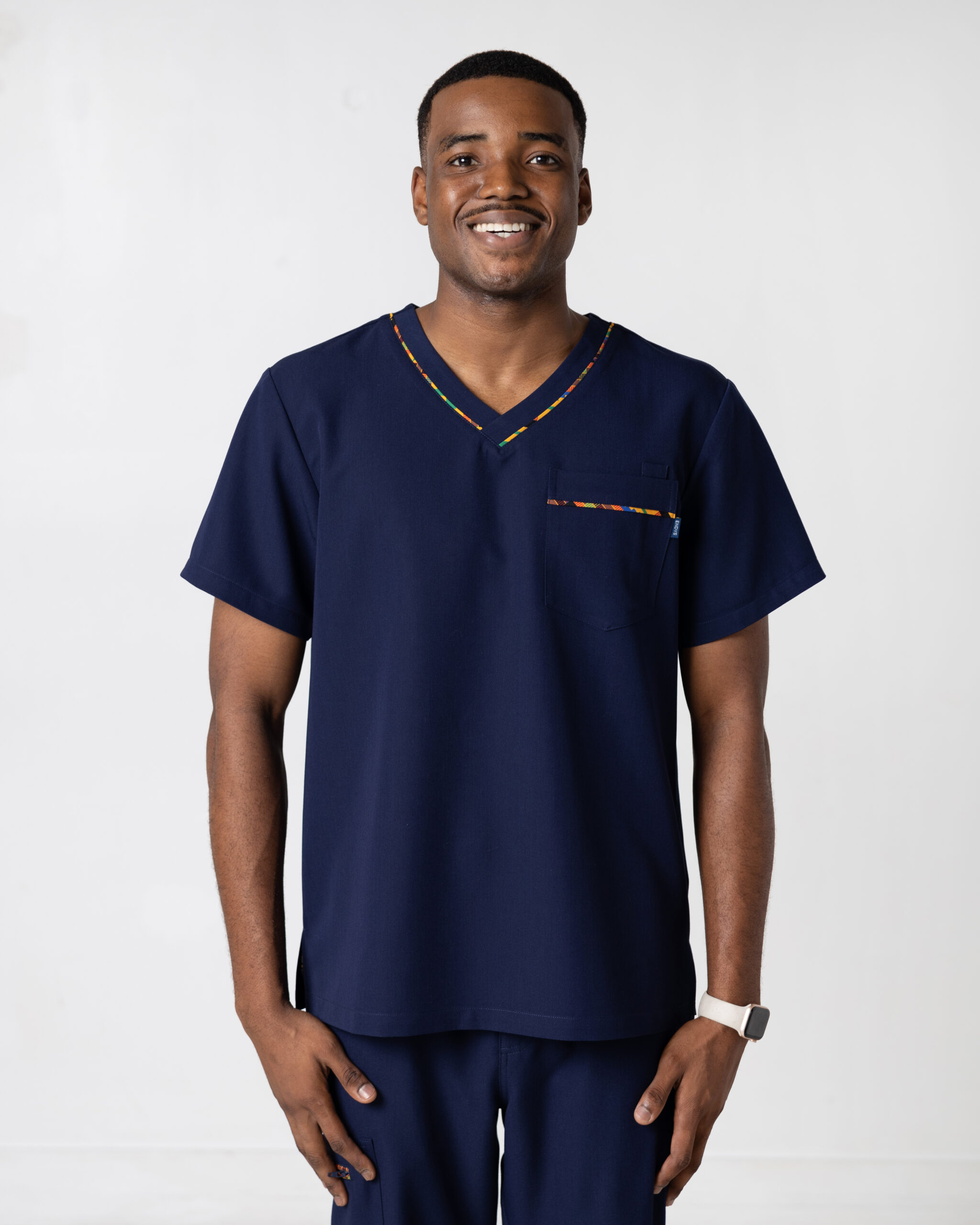 Inspired by the bold patterns of Ghana’s Kente cloth, this scrub honors generations of weavers.