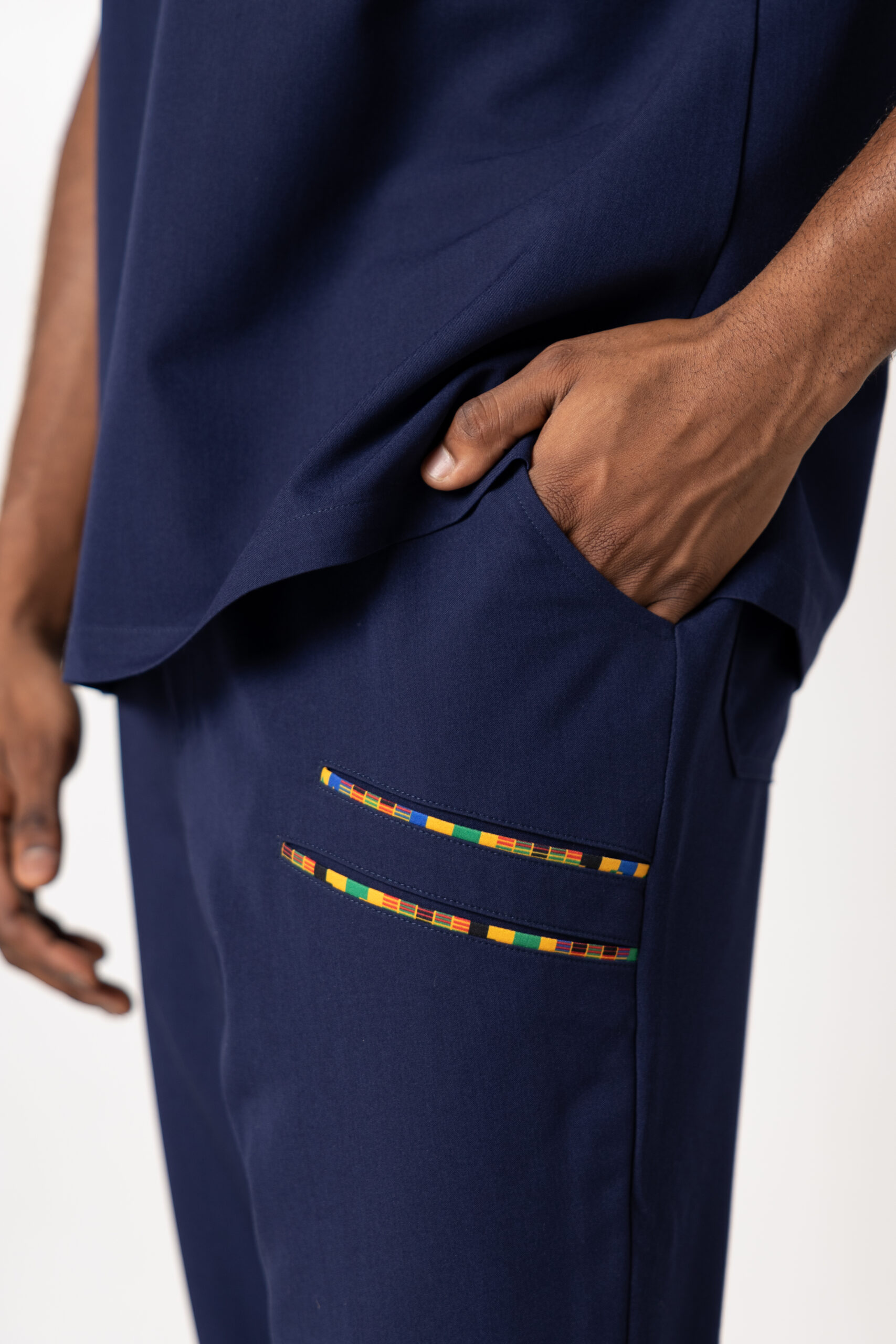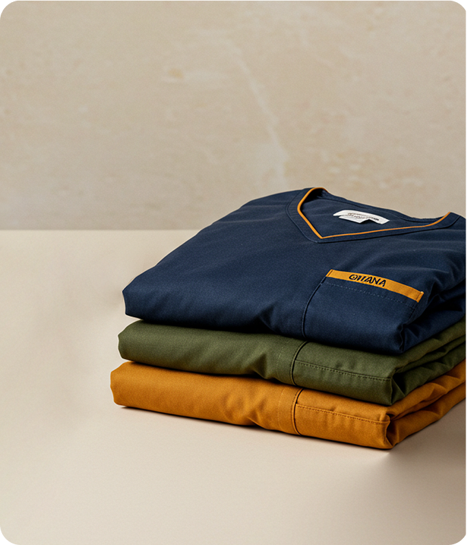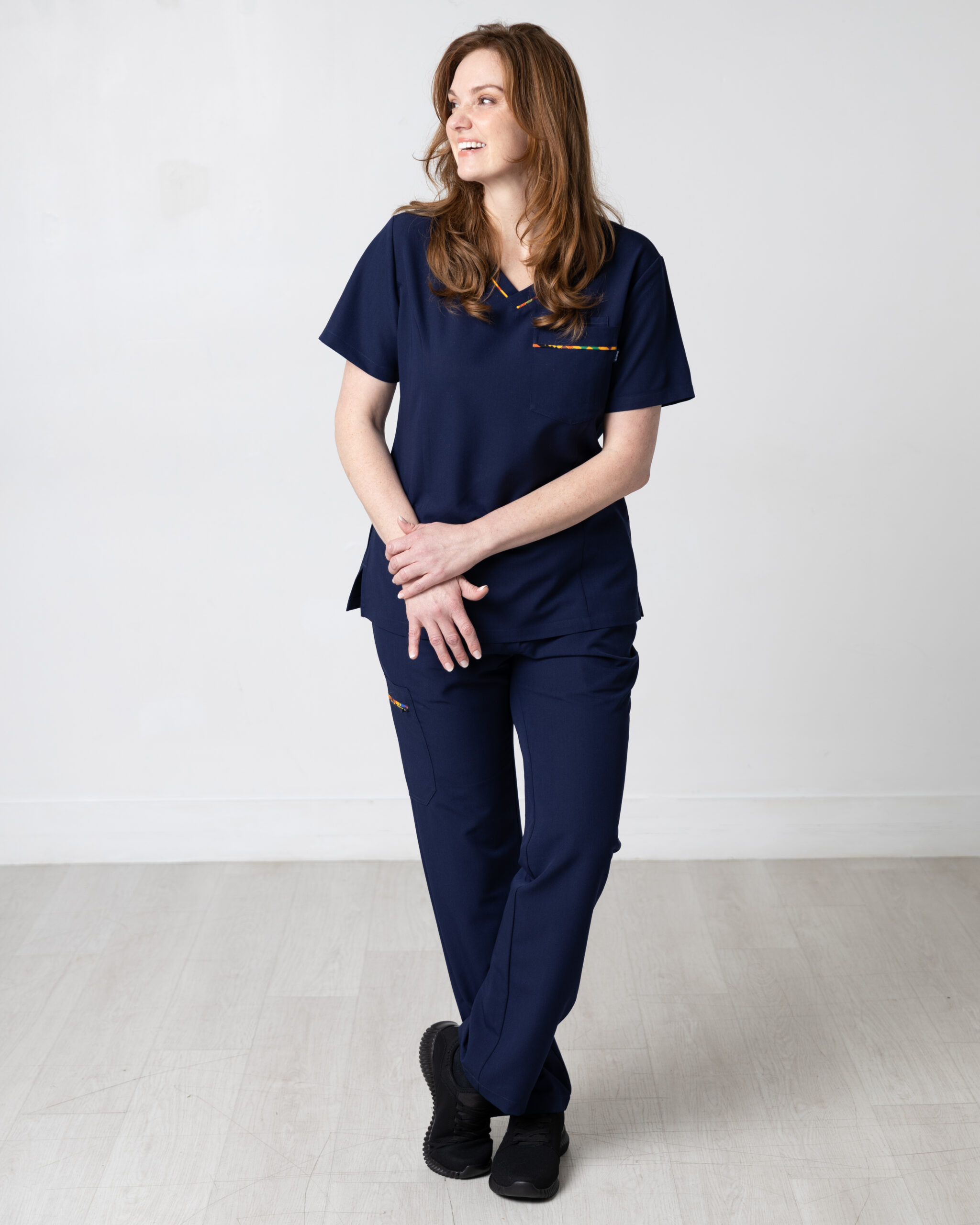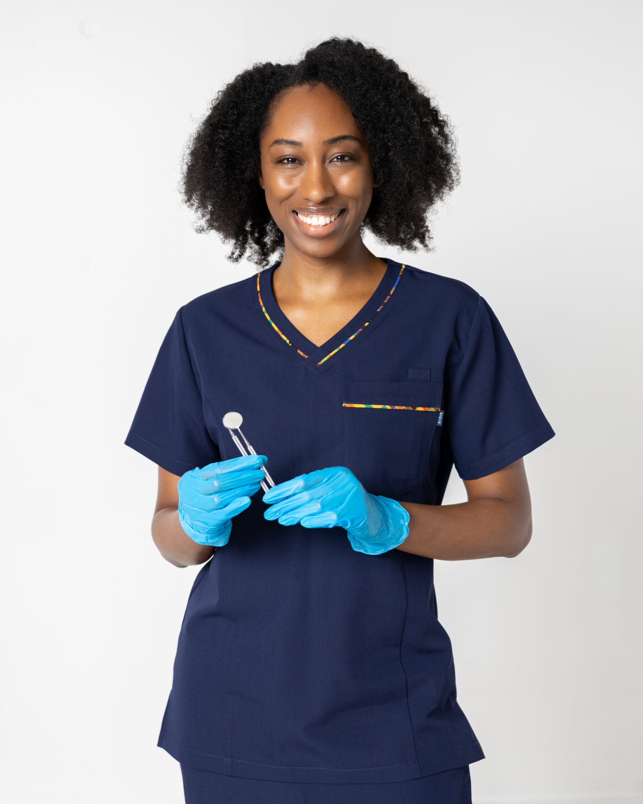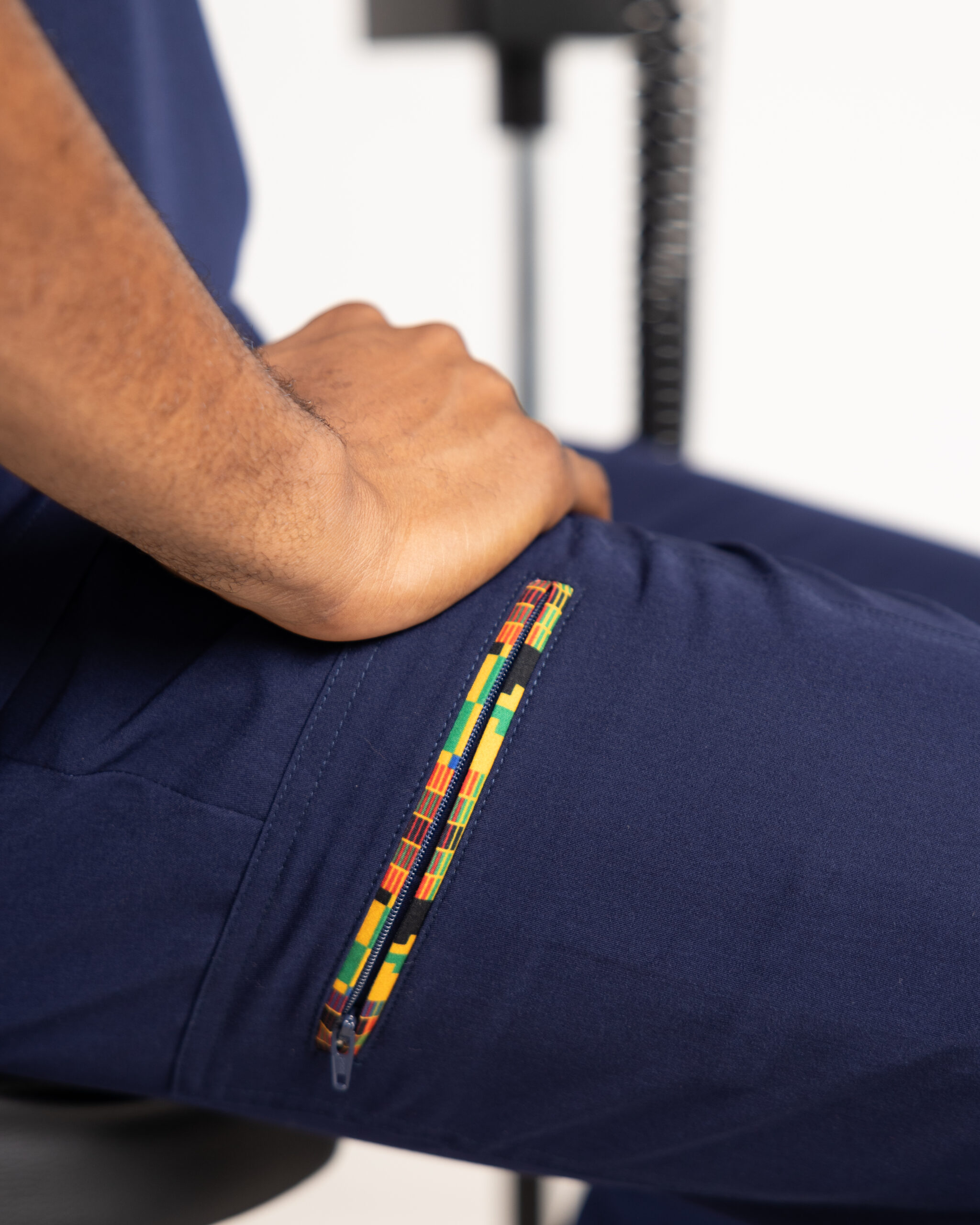 Inspired by the bold patterns of Ghana’s Kente cloth, this scrub honors generations of weavers.
